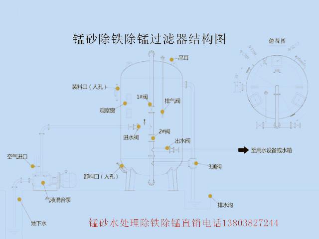 錳砂過濾器除鐵除錳工作原理;當含鐵(錳)的地下水經沖氣或加入氧化劑后,水中鐵(錳)離子開始氧化,當水流經錳砂濾層時,在濾層中發生接觸氧化反應及濾料表面生物化學作用和物理截留吸附作用,使水中鐵(錳)離子沉淀去除。尤其是在處理微污染含錳地下水的過程中,鐵細菌不僅能有效地去除鐵錳,同時還能以水中氨為營養源,進行新陳代謝,在其他細菌參與下,同時達到去氨氮的效果。利用多介質濾料的截留、濾除作用,去除大粒徑的雜質顆粒、膠體和懸浮物,具有低成本、操作維護及管理方便等特點。常見采用石英砂、無煙煤濾料、錳砂、AFM、活性炭等,濾速高,截污能力大,過濾周期長,罐體有玻璃鋼、碳鋼、不銹鋼多種材質,可配多路閥或電動、氣動、水動閥配PLC控制,分別適用于中小流量及大流量情況,可實現自動和手動雙重控制。最高過濾精度可達5微米。鐵錳氧化反應式如下:鐵氧化:空氣:4Fe2++3O2+6H2O=4Fe(OH)3 錳砂 MnOMn2O7+4Fe2++2O2+6H 2O=3MnO2 +4Fe(OH)3 ;錳氧化:Mn2++O2=MnO2,錳砂Mn2++MnO2·H2O= MnO2·MnOH2O+2H+。